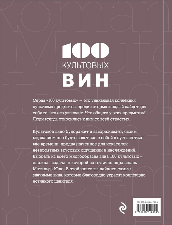 Название книги говорит само за себя! Она знакомит с сотней самых элитных, качественных, очаровывающих своим вкусом и ароматом вин. У каждого вина своя история, свой возраст, свой характер. Но есть то, что их несомненно объединяет - их величие! Созданные самыми опытными виноделами, выдержанные в течение продолжительного времени, эти вина по праву называются культовыми. Матильда Юло, автор этой книги, говорит: "Культовое вино будоражит и завораживает, своим мерцанием оно будто зовет нас с собой в путешествие вне времени, предназначенное для искателей невероятных вкусовых ощущений и наслаждений".