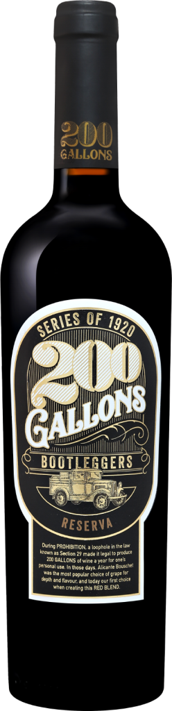 200 Gallons, Bootleggers Reserva — плотное, сбалансированное красное полусухое вино, созданное из купажа винограда сортов Аликанте Буше и Каштелау, выращиваемых на виноградниках полуострова Сетубал. После сбора урожая по достижении виноградом оптимальной спелости, ягоды тщательно сортируются и мягко прессуются. Терморегулируемая алкогольная ферментация протекает в чанах из нержавеющей стали и завершается длительной постферментационной мацерацией. Вино выдерживается 6 месяцев в бочках из французского и американского дуба, приобретая бархатистую текстуру, округлые танины и изысканные оттенки сладких специй.
