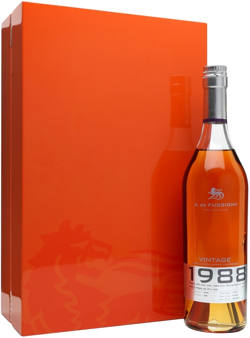 Виноград для изготовления спиртов коньяка А. де Фуссиньи, "Миллезим", 1988 выращен в регионе Фин Буа. Розлив в очень малом количестве состоялся в 2011 году.
