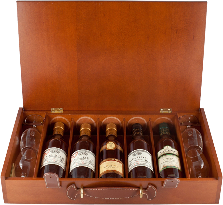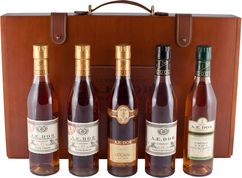 Оригинальный подарочный набор в деревянном кейсе, составлен из пяти коньяков А.Е.Дор.