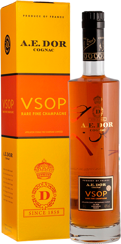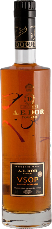 А.Е. Dor, VSOP Rare Fine Champagne— восхитительный восьмилетний коньяк, в ассамбляже которого присутствуют спирты из регионов Гранд Шампань и Пти Шампань. Выдержка во влажном погребе подарила напитку удивительно мягкий характер и превосходное длительное послевкусие. Коньяк обладает роскошным, немного жгучим ароматом, который затем превращается в яркий цветочный букет. Великолепное качество абсолютно неагрессивного вкуса обусловлено добавлением очень мягкой, родниковой, очищенной от нежелательных минералов воды из источника Жансак, который находится в Сенгозаке (столица Гран Шампани).
