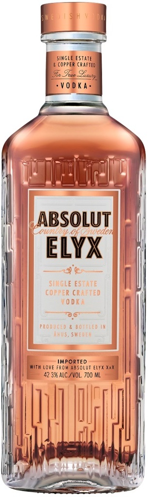 Absolut, Elyx — роскошная водка, которая производится исключительно вручную в медных кубах. Ее успех заключается в высочайшем качестве и богатейшем опыте мастеров. Водка обладает насыщенным и в то же время изысканным, мягким вкусом, который производитель называет "жидким шелком".
