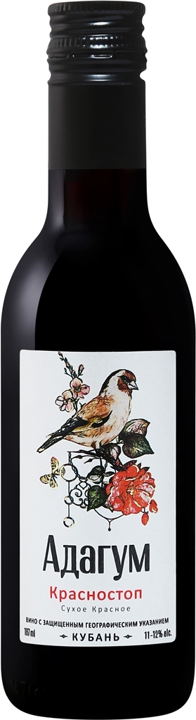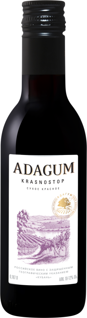 Адагум, Красностоп — красное сухое вино с привлекательным ароматом и сочным вкусом с доминирующими тонами лесных ягод. Виноград сорта Красностоп Золотовский для изготовления вина выращивается в Краснодарском крае, в защищенном географическом указании Кубань, что гарантирует качество винограда и строго контролируемые правила изготовления вина. "Адагум" Красностоп рекомендуется подавать к мясу, приготовленному на гриле, блюдам с мягкой текстурой, пицце и твердым сырам.