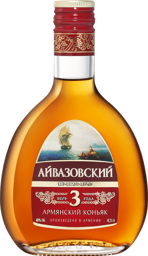 Элегантный коньяк "Айвазовский" 3-летний изготовлен по традиционному армянскому рецепту и обладает характерным, классическим вкусом коньяков Араратской Долины. Коньяк назван в честь художника-мариниста, Ивана Константиновича Айвазовского. Выдержка коньяка проводится в дубовых бочках и длится 3 года. Коньяк рекомендуется употреблять в чистом виде, а также сочетать с мясными деликатесами, рыбой, сырами, десертами и спелыми абрикосами, добавлять в коктейли или кофе.