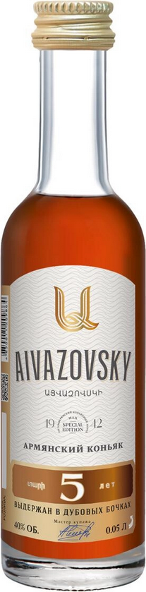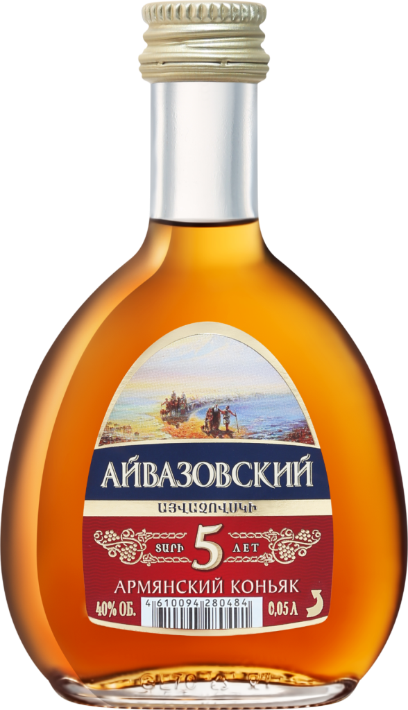 Элегантный коньяк "Айвазовский" 5-летний изготовлен по традиционному армянскому рецепту и обладает характерным, классическим вкусом коньяков Араратской Долины. Коньяк назван в честь художника-мариниста, Ивана Константиновича Айвазовского. Выдержка коньяка проводится в дубовых бочках и длится 5 лет. Коньяк рекомендуется употреблять в чистом виде, а также сочетать с мясными деликатесами, рыбой, сырами, десертами и спелыми абрикосами, добавлять в коктейли или кофе.