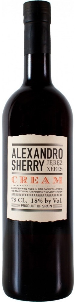 Сладкий херес "Alexandro" Cream производится в зоне Херес-де-ла-Фронтера из винограда Паломино Фино и Педро Хименес. Обладает насыщенным ароматом с тонами пряностей, меда и изюма, имеет выразительный вкус с пикантным горьковатым финалом.