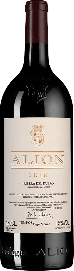 Революционное и независимое, вино "Алион" символизирует универсальный и перспективный дух винодельни Вега Сицилия. Это признанное вино известно своей элегантностью, тонкостью и большой гладкостью. С момента создания хозяйства у этого вина был уникальный характер — уже тогда вино могло похвастаться ярким ароматом и вкусом, выражающими природу винограда сорта Тинто Фино, выращенного в регионе Рибера дель Дуэро. Виноград для изготовления вина собирается с нескольких участков с хорошо дренированными, глубокими почвами с наличием кварцитов. Средний возраст лоз составляет 25-30 лет. При винификации применяются самые современные методы энологии. Для винификации и выдержки вина используются новые бочки из французского дуба, изготовленные на лучших бондарнях региона Бордо. После розлива вино еще не менее 15 месяцев дозревает в тишине подвалов винодельни.