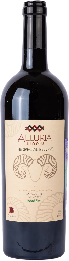 Красное полусладкое вино Alluria, The Special Reserve создается в армянском регионе Сюник. Виноград редкого автохтонного сорта Хндогни собирается вручную в окрестностях Эчмиадзина. После тщательной сортировки ягоды подвергаются мягкому прессованию, затем начинается спонтанная ферментация сусла без добавления культурных дрожжей и с минимальным использованием сульфитов. Выдержка проходит в бочках из кавказского дуба, что обеспечивает вину насыщенность и глубину вкуса. Производство ограничено малыми партиями, что подчеркивает уникальность каждой бутылки.