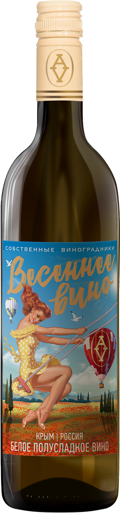 Alma Valley, "Spring Wine" — белое полусладкое вино, изготовленное из винограда, выращенного в Альминской Долине. Гармоничный купаж четырех сортов: Траминер, Пти Арвин, Рисланер и Шардоне, которые, сочетаясь, создают изящный легкий аккорд, ассоциируется с весной. Вино недаром назвали "Весенним" — его мягкий полусладкий вкус напоминает о свежести первых цветов и солнечном небе.