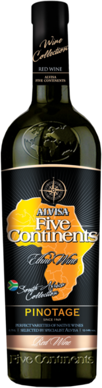 Alvisa, "Five Continents" Pinotage — красное сухое вино, созданное из винограда сорта Пинотаж, родиной которого считается ЮАР. Винификация проводится традиционным для красных вин способом, проходящим со строгим температурным контролем. Вино станет прекрасным сопровождением для блюд из красного мяса, например бараньих отбивных, жаркого из пернатой дичи, сыров.