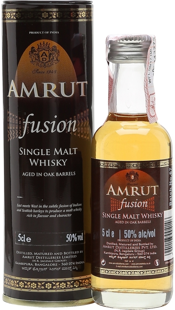 Amrut, Fusion — односолодовый индийский виски, который не подвергался холодной фильтрации. Этот напиток получил свое название из-за того, что при его приготовлении производитель использовал два сорта отборного ячменя: индийский, выращенный у подножия Гималаев, и шотландский. Крепость виски составляет 50%. Дистилляция небольшими партиями позволила сохранить натуральный аромат. "Амрут" Фьюжн выдерживали в дубовых бочках в уникальных условиях тропического климата, на высоте 3 тысяч метров над уровнем моря, в Бангалор — индийском городе-саде.