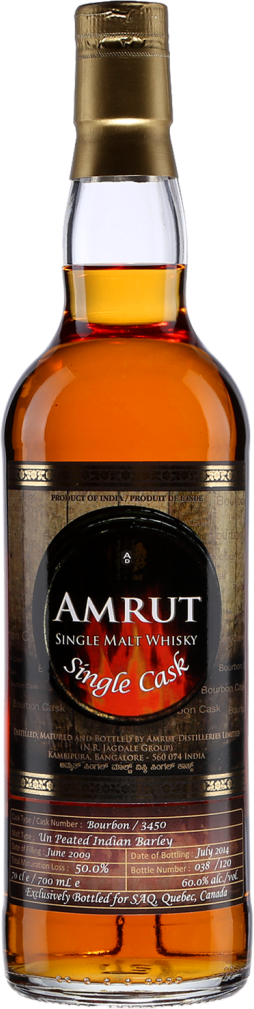 Amrut, Single Cask Bourbon — односолодовый индийский виски, который не подвергался холодной фильтрации. Крепость напитка составляет 60%. В изготовлении виски использовался отборный ячмень, выращенный у подножия Гималаев. Дистилляция небольшими партиями позволила сохранить натуральный аромат. "Амрут" выдерживали в американских дубовых бочках и бочках из-под бурбона, что придало напитку превосходное сочетание тонов специй и традиционных, сладких фруктовых ноток. Выдержка проходила в уникальных условиях тропического климата, на высоте 3 тысяч метров над уровнем моря, в Бангалор — индийском городе-саде.
