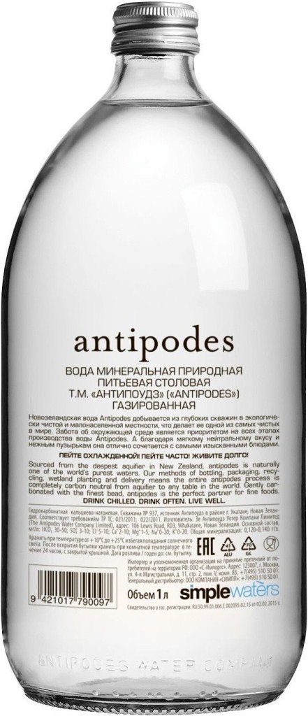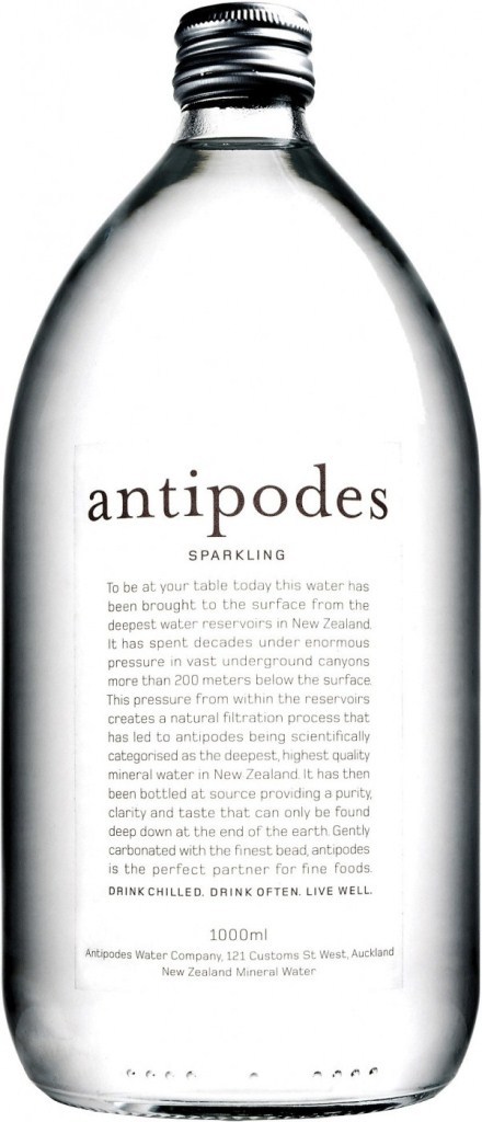 Минеральная столовая питьевая газированная вода "Antipodes" берет свое начало в самом экологически чистом месте на земле, на северных островах Новой Зеландии, где на тысячи километров в округе нет никакой промышленности. Источник, из которого добывается вода, залегает на глубине 327-336 метров, на прохождение природного фильтра (слоев почвы) дождевой воде требуется более 50 лет. Вода разливается в бутылки прямо у родника Отакири в городе Вакатан, расположенном в мало заселенной местности Ротома Хиллз. Слоган компании-производителя гласит: "Drink chilled. Drink often. Live well." ("Пейте охлажденной. Пейте часто. Живите хорошо.")