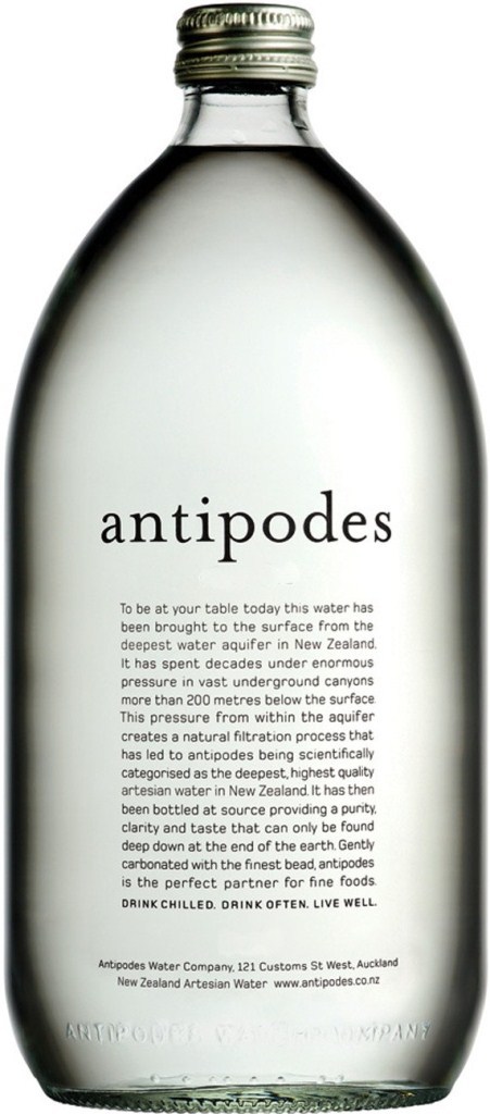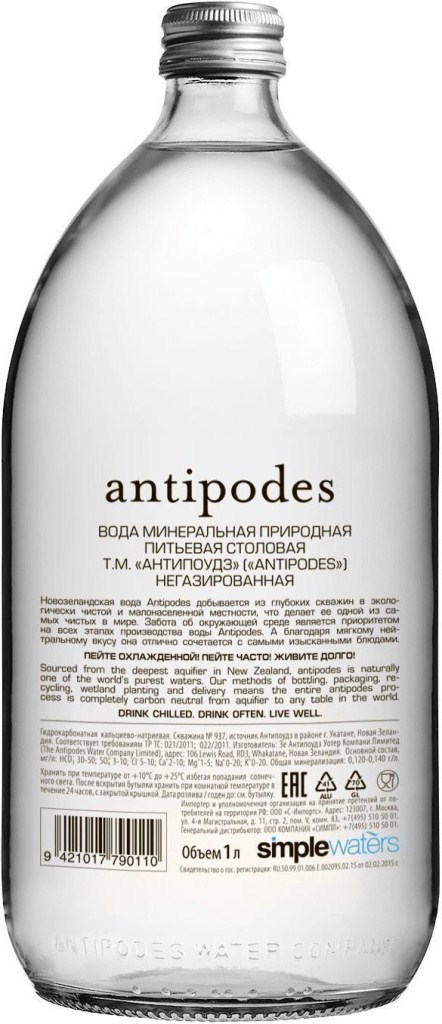 Родниковая столовая питьевая негазированная вода "Antipodes" берет свое начало в самом экологически чистом месте на земле, на северных островах Новой Зеландии, где на тысячи километров в округе нет никакой промышленности. Источник, из которого добывается вода, залегает на глубине 327-336 метров, на прохождение природного фильтра (слоев почвы) дождевой воде требуется более 50 лет. Вода разливается в бутылки прямо у родника Отакири в городе Вакатан, расположенном в мало заселенной местности Ротома Хиллз. Слоган компании-производителя гласит: "Drink chilled. Drink often. Live well." ("Пейте охлажденной. Пейте часто. Живите хорошо.")