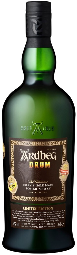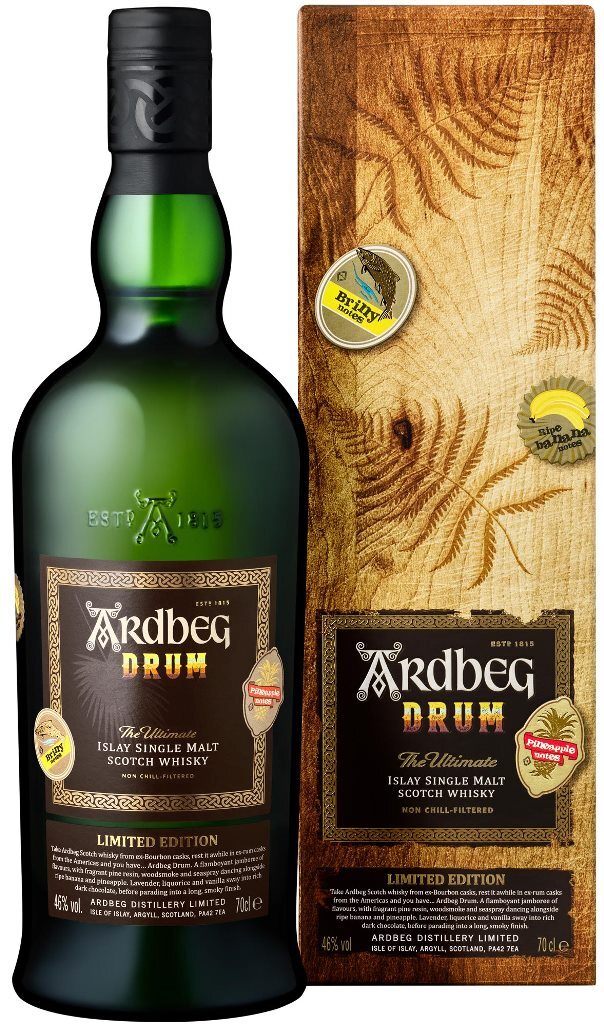 Ardbeg, "Drum" — яркий, задорный, очень дымный виски, изготовленный для дней винокурни Ардбег на ежегодном празднике "Feis Ile, 2019". "Feis Ile" — это недельный фестиваль музыки и солода, который проводится на острове Айла каждый год в последнюю неделю мая. Это праздник острова, его культуры, истории и, конечно же, виски. Выпущенный к "Fèis Ìle", а затем прошествовавший по всему миру, односолодовый виски "Drum" объединил лучшие качества острова Айла и островов Карибского бассейна, так как он сначала выдерживался в бочках из-под бурбона, а затем в бочках из-под рома. Конечный результат — вкусный, дымный, фруктовый драм, по-настоящему захватывающий дух карнавала.