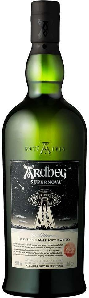 Ardbeg, Supernova — выпущенный ограниченным тиражом односолодовый релиз 2019 года. Задача этого виски — доставить ваши вкусовые рецепторы в неизвестные торфяники. "Супернова" изменит ваше сенсорное представление о том, каким может быть виски. Тяжелый торпедный "Supernova" звездных размеров, этот драм — настоящее похищение чувств. После выдержки в бочках из-под бурбона, которая привнесла в яркие торфяные и дымные тона легкие оттенки ириски и патоки, виски был разлит по бутылкам без холодной фильтрации при бочковой крепости в 53,8%.