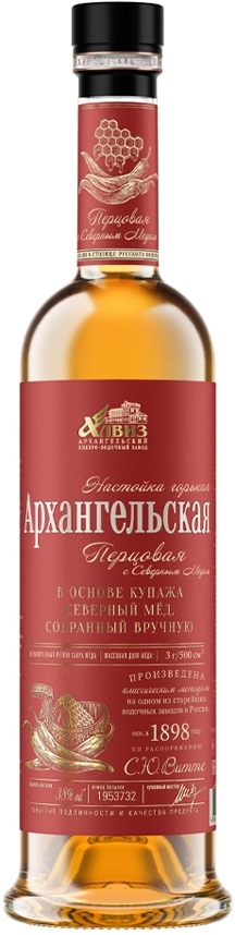 Настойка горькая "Архангельская" Перцовая с Северным Медом изготовлена из ректификованного этилового спирта класса "Люкс", мягкой северной воды, прошедшей трехступенчатый процесс очистки: угольный, катионный и механический, а также спиртованного настоя нескольких видов жгучего перца и натурального меда, добытого в диких лесах северных регионов. Мед собирают в экологически чистых, климатически и биологически благоприятных местах Русского Севера. Мед является богатым источником витаминов и минералов, макро- и микроэлементов. В плодах острого перца содержится большое количество эфирных масел, витаминов Р, В1, В2, С, а также перец обладает высоким бактерицидным и возбуждающим аппетит свойствами. Благодаря классическому методу производства все полезные свойства сохраняются, а вкус настойки приобретает удивительную мягкость. Настойку рекомендуется употреблять в чистом виде, сочетать с блюдами традиционной русской кухни.