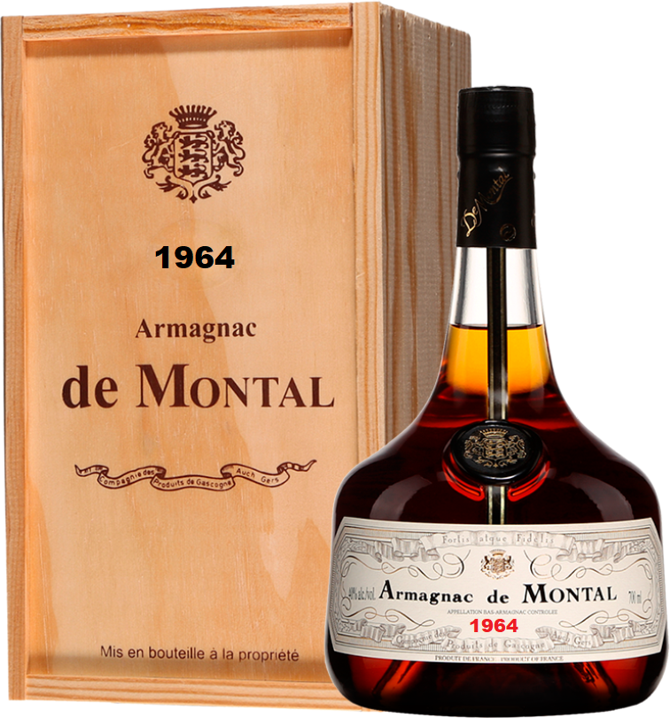 Armagnac de Montal, 1964 — винтажный арманьяк, выдержанный в дубовой бочке. Мягкий и влажный климат региона Ба-Арманьяк способствует своевременному созреванию винограда, а богатые кремнием и глиной почвы дают арманьякам легкость и ароматность тонких фруктовых оттенков. Старение арманьяков в компании Монталь проходит в древних погребах, принадлежащих Шато де Рьетор. Согласно технологии изготовления, после перегонки арманьяк помещается в огромные 400-литровые бочки, которые были специально изготовлены из белого дуба, растущего в лесах Монлезон и Ле Фреш. В процессе выдержки арманьяк вбирает в себя древесные танины, а также аромат и цвет дуба, приобретает интенсивный, насыщенный букет с тонами чернослива и кофе и мягкий, маслянистый сложный вкус.