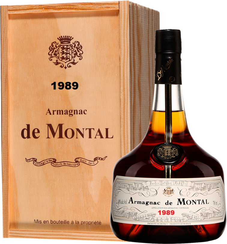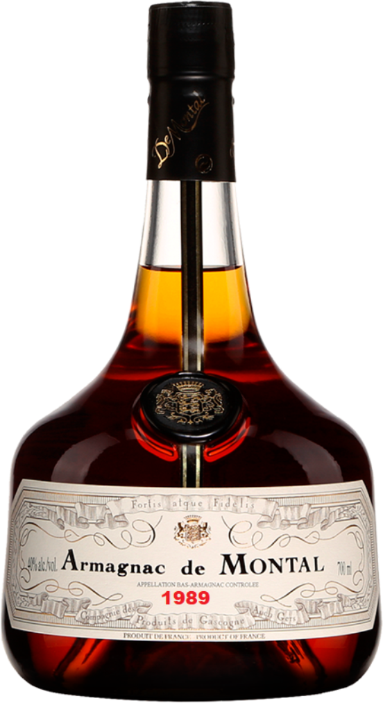 Armagnac de Montal, 1989 — винтажный арманьяк, выдержанный в дубовой бочке. Мягкий и влажный климат региона Ба-Арманьяк способствует своевременному созреванию винограда, а богатые кремнием и глиной почвы дают арманьякам легкость и ароматность тонких фруктовых оттенков. Сбор урожая производится ночью, виноград поступает на винодельню при температуре не выше 15 °С, максимально сохраняя свой потенциал. Для того, чтобы сохранить богатый аромат винограда, дистилляцию вина для арманьяка де Монталь производят рано — с ноября по Рождество, хотя официально разрешено завершать дистилляцию 31 января следующего года. Сама дистилляция производится с использованием трех медных перегонных колонн. В них проходит непрерывная дистилляция, которая сохраняет характеристики каждого сорта и дает очень насыщенные о-де-ви, подходящие для долгой выдержки. Старение арманьяков Монталь проходит в древних погребах Шато де Рьетор. После перегонки арманьяк помещается в огромные 400-литровые бочки, которые были специально изготовлены из белого дуба, растущего в лесах Монлезон и Ле Фреш. В процессе выдержки арманьяк вбирает в себя древесные танины, а также аромат и цвет дуба, приобретает интенсивный, насыщенный букет и мягкий, маслянистый сложный вкус.