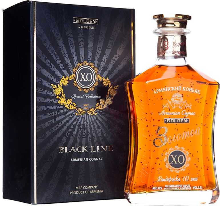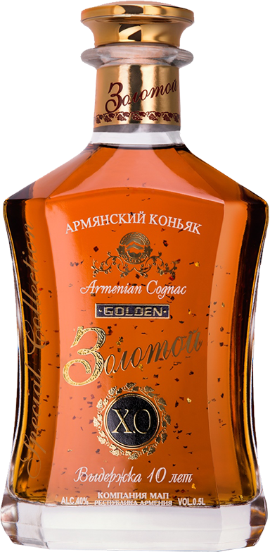 Уникальный коньяк с содержанием сусального золота "Золотой" ХО, 10-летний изготовлен из купажа лучших коньячных спиртов Араратской долины. Возраст самого молодого коньячного спирта составляет 8 лет, а самого старого — 20 лет. Существует поверье, что золотосодержащий алкогольный напиток приносит богатство и счастье тому, кто его выпьет. Коньяк "Золотой" с сусальным золотом станет эксклюзивным подарком на любое торжество!
