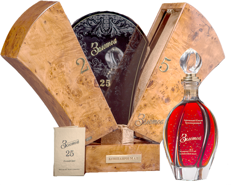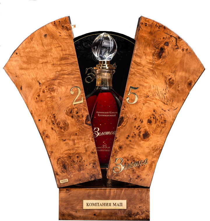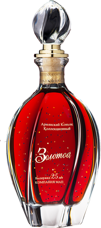 Уникальный коньяк с содержанием сусального золота Golden, 25 Years Old, 25-летний изготовлен из купажа лучших коньячных спиртов Араратской долины. Возраст самого молодого коньячного спирта составляет 15 лет, а самого старого — 50 лет. Существует поверье, что золотосодержащий алкогольный напиток приносит богатство и счастье тому, кто его выпьет. Коньяк "Золотой" с сусальным золотом станет эксклюзивным подарком на любое торжество!