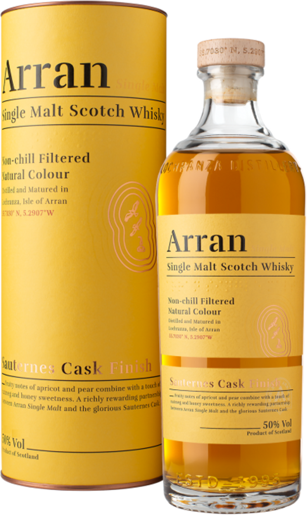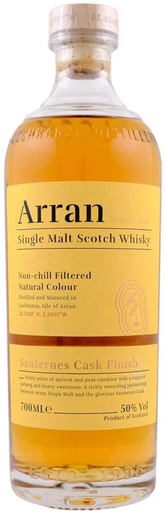 Виски Arran Sauternes Cask Finish, изготовленный из одного вида солода, выдерживался на протяжении 10 лет. Основная выдержка осуществлялась в дубовых бочках, специально привезенных из итальянской провинции, где налажен выпуск вина Амароне. На протяжении последних 9 месяцев проводилась довыдержка виски в дубовых бочках, в которых ранее созревало французское белое сладкое вино "Sauternes" — отсюда и название виски. Белое сладкое вино привнесло дополнительные оттенки меда во вкус виски. Розлив в бутылки проводился при крепости 50%. По консистенции виски Арран Сотерн Каск Финиш — густой, приближенный к сиропообразному состоянию, а по вкусу напоминает лимон с сахаром. Подарочная упаковка, выполненная в виде тубы, делает его достойным подарком по любому поводу.