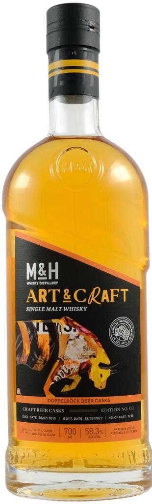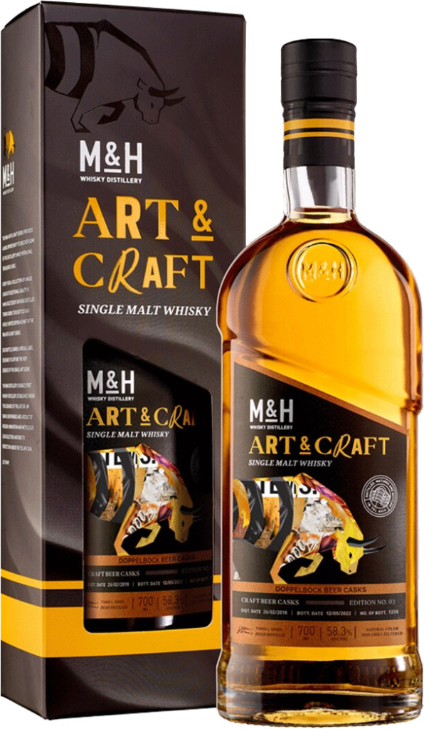 Art & Craft, Doppelbock Beer Casks - уникальный односолодовый виски, выдержанный на протяжении не менее 3-х лет в исключительных бочках. Сначала в этих бочках выдерживался бурбон, затем их отправили на израильскую крафтовую пивоварню Ha’Aretz, расположенную на самом краю пустыни Негев, где в них в течение 4-6 месяцев созревал DoppelBock (двойной бок), для которого характерны сладкий аромат и вкус, богатый оттенками шоколада и поджаренного солода. Одна из бочек для этого релиза провела целый год на складе у Мертвого моря, что усилило ее потенциал. Лишь в конце этого долгого путешествия бочки были наполнены виски на винокурне M&H. Виски не подвергается холодной фильтрации и не содержит красителей, разливается при бочковой крепости 58,3%.
