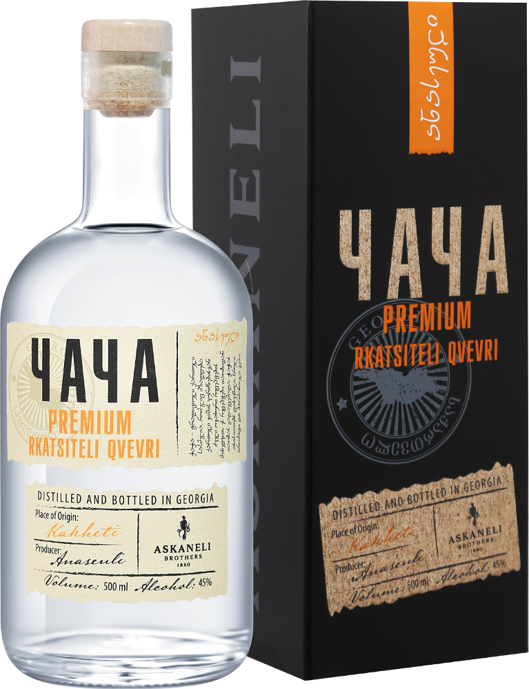 Askaneli, Chacha Premium Rkatsiteli Qvevri — чача класса Премиум, обладающая тонким, многогранным ароматом и мягким, обволакивающим вкусом. Чача изготавливается из винограда сорта Ркацители, выращенного в Кахетии. При изготовлении чачи применяется фракционная или прямая дистилляция выжимок Ркацители от вина из квеври, проходящая в медных перегонных кубах. "Сердце" дистиллята тщательно отделяется и используется для дальнейшего приготовления напитка, а другие фракции, как правило, добавляют в следующую партию сброженного сусла перед перегонкой. Перед розливом дистиллят разбавляется умягченной водой до достижения напитком требуемой крепости.