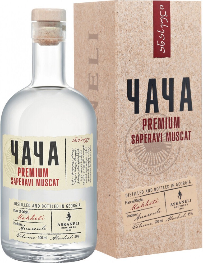 Askaneli, Chacha Premium Saperavi-Muscat — чача класса Премиум, обладающая нежным, многогранным ароматом и деликатным, мягким вкусом. Чача изготавливается из винограда сортов Саперави и Мускат, выращенного в Кахетии. При изготовлении чачи применяется фракционная или прямая дистилляция виноградных выжимок в медных перегонных кубах. "Сердце" дистиллята тщательно отделяется и используется для дальнейшего приготовления напитка, а другие фракции, как правило, добавляют в следующую партию сброженного сусла перед перегонкой. Перед розливом дистиллят разбавляется умягченной водой до достижения напитком требуемой крепости.