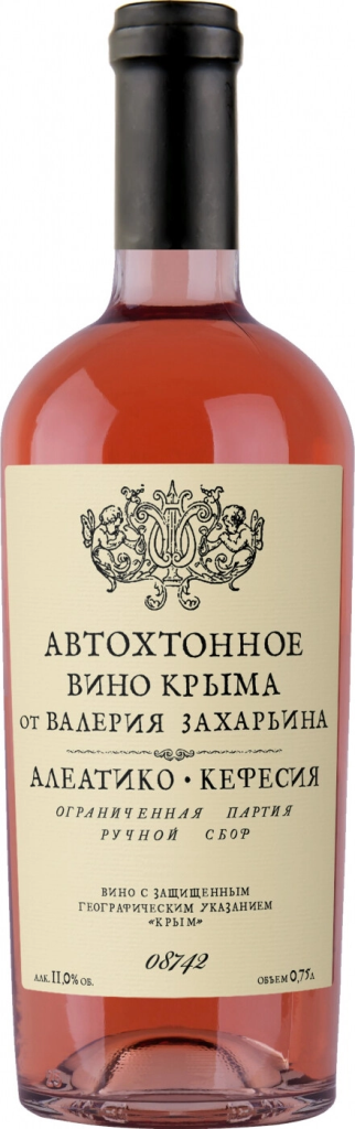 Автохтонное вино Крыма от Валерия Захарьина, Алеатико-Кефесия — интересное и оригинальное розовое сухое вино, которое является творением талантливого винодела Валерия Захарьина. Он принял решение сочетать в одном купаже автохтонный итальянский сорт Алеатико и крымский Кефесия. Виноград выращивается в Западно-Предгорной части Крыма. Сбор урожая осуществляется вручную. Виноград доставляется на винодельню как можно быстрее для сохранения свежести. На винодельне виноград очищается от гребней, мягко дробится, проходит краткую мацерацию на кожице и ферментируется в стальных чанах. Брожение осуществляется при контролируемой температуре. Перед бутилированием готовый купаж осветляется и выдерживается в нейтральных емкостях. Ежегодный объем производства вина ограничен, каждая бутылка пронумерована.