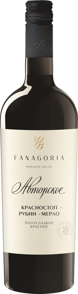 Красное полусладкое "Авторское Вино" Красностоп-Рубин-Мерло производится из винограда сортов Красностоп, Рубин Голодриги и Мерло, выращенного на фанагорийских виноградниках винодельческого региона "Кубань. Таманский полуостров" с контролем урожайности. Виноград собирают вручную в момент, когда ягоды достигают оптимальной степени зрелости. После тщательной сортировки и отделения от гребней плоды подвергают ферментации в пижажных винификаторах при регулируемой температуре и яблочно-молочному брожению на мезге в емкостях из нержавеющей стали. Затем вино выдерживается в дубовых бочках. Вино рекомендуется употреблять в качестве дижестива, с ягодными и шоколадными десертами, а также пиццей с томатным соусом и выдержанными сырами.