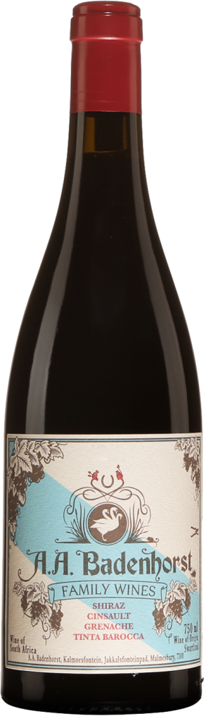 Badenhorst, "Family Wines" Red Blend, Swartland — роскошное красное вино, созданное из купажа 5 сортов винограда: Сенсо, Шираз, Гренаш, Тинта Баррока и Турига Насьональ. Небольшие партии отборных фруктов поставляются с семи виноградников семейной фермы Kalmoesfontein, а также с виноградников соседей, которые разделяют философию A.A. Badenhorst. Сбор урожая проводится исключительно вручную, на винодельне плоды подвергаются сортировке с последующим охлаждением в течение ночи. Ферментация сусла проходит в бетонных и деревянных резервуарах, 40% ягод подвергаются гребнеотделению. Целые грозди топчут ногами для извлечения сока, что способствует также началу естественного брожения. Сусло, ферментированное в закрытых бетонных резервуарах, оставляют в контакте с мезгой на 3-6 месяцев перед прессованием. Винификация проходит с минимальным добавлением серы. Мацерация на кожице длится 3-6 месяцев. Вино выдерживается в старых 4000-литровых чанах (92%) и новых 600-литровых бочках (8%) в течение 16 месяцев. В это время регулярно осуществляется доливка, но вино не переливается до самого розлива в бутылки.