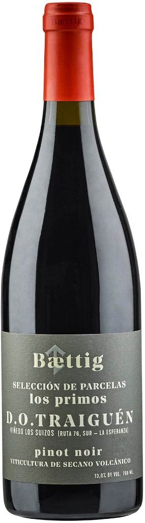 Baettig, Los Primos, Pinot Noir — глубокое и хорошо структурированное красное сухое вино, для изготовления которого используют виноград сорта Пино Нуар, который выращивается на вулканических почвах в 3,5 км от города Трайгуэн. Благодаря содержанию глины и обилию вулканических пород почвы очень плодородные и влажные, что обеспечивает сбалансированный рост растений. Климат здесь средиземноморский, с умеренно жарким летом и холодной дождливой зимой, такие условия гарантируют равномерное созревание винограда. Сбор урожая осуществляется вручную. На винодельне большая часть винограда очищается от стеблей, 31% урожая винифицируется целыми гроздьями. Ферментация протекает в чанах из нержавеющей стали под воздействием диких дрожжей. По завершении спонтанного брожения вино выдерживается в 300-литровых бочках из французского дуба, 21% из которых — новые, на протяжении 18 месяцев.