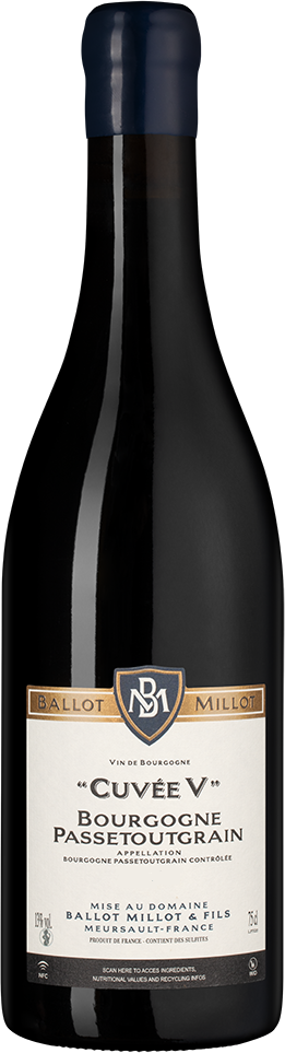 Ballot Millot, Bourgogne Passetoutgrain, Cuvee V — это элегантное и сбалансированное вино, созданное из взаимодополняющих друг друга сортов Гаме и Пино Нуар. Виноград растёт на семейных виноградниках, которые обрабатываются органическими способами. Хозяйство практикует минимум вмешательства в процесс виноделия. Мацерация проходит с использованием цельных гроздей. Вино выдерживается 12 месяцев в дубовых бочках до бутилирования. Вино разливается по бутылкам без осветления и фильтрации.