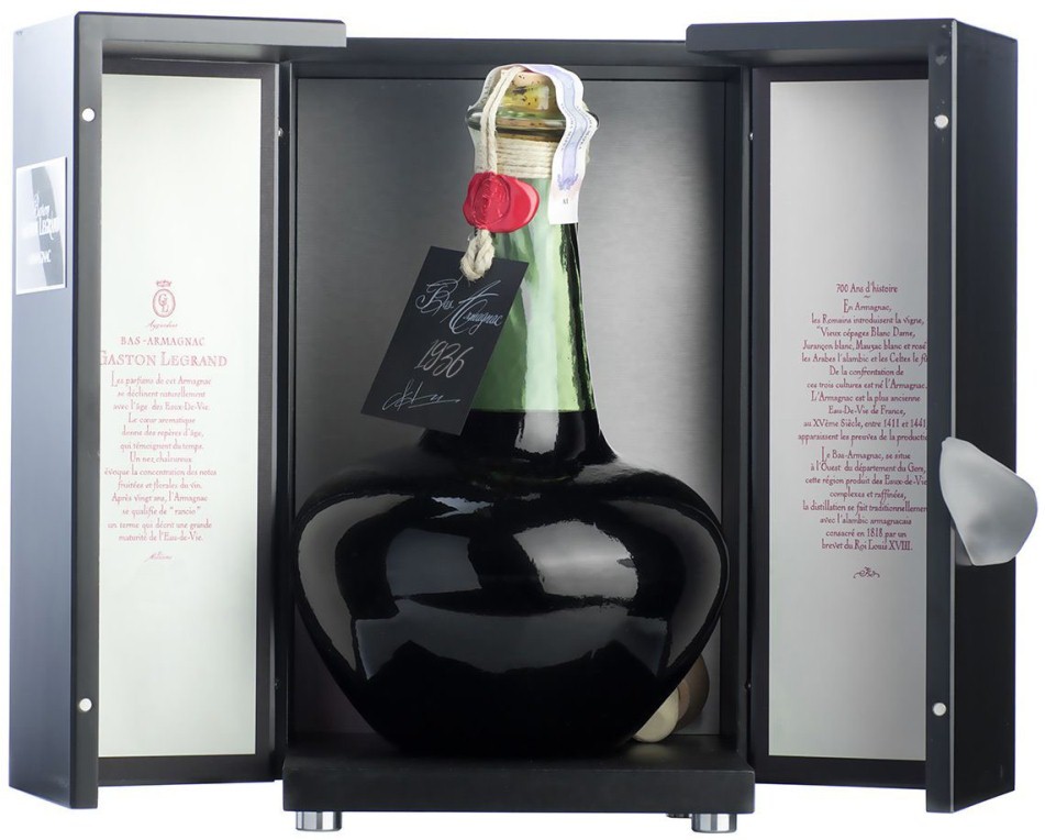 Baron G. Legrand, Bas Armagnac, 1936 — этот арманьяк с превосходно сбалансированными вкусом и ароматом. За долгое время выдержки его спирты потеряли агрессивность и приобрели приятную танинность. Безупречное качество арманьяка согреет тело и душу, подарив изысканное наслаждение. Год производства арманьяка указывается на бутылке. При этом на контрэтикетке можно найти еще и конкретную дату розлива.