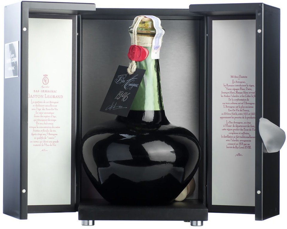 Baron G. Legrand, Bas Armagnac, 1946 — этот арманьяк с превосходно сбалансированными вкусом и ароматом. За долгое время выдержки его спирты потеряли агрессивность и приобрели приятную танинность. Безупречное качество арманьяка согреет тело и душу, подарив изысканное наслаждение. Год производства арманьяка указывается на бутылке. При этом на контрэтикетке можно найти еще и конкретную дату розлива.