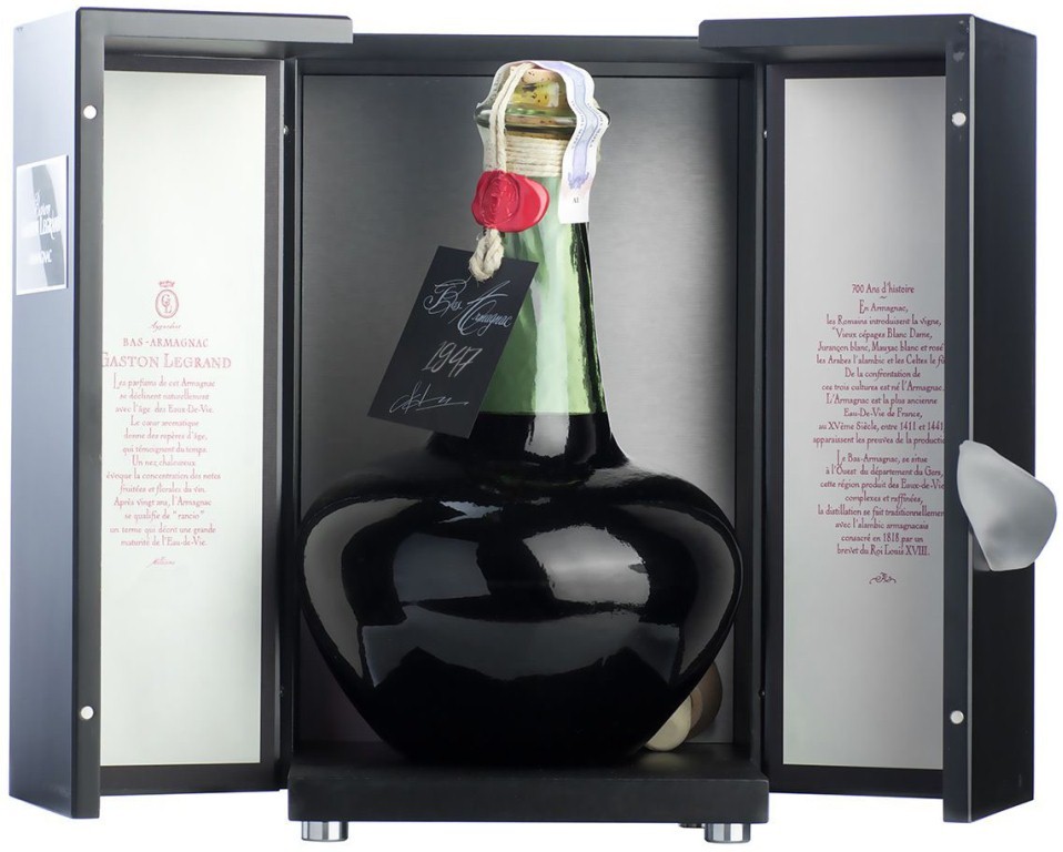 Baron G. Legrand, Bas Armagnac, 1947 — этот арманьяк с превосходно сбалансированными вкусом и ароматом. За долгое время выдержки его спирты потеряли агрессивность и приобрели приятную танинность. Безупречное качество арманьяка согреет тело и душу, подарив изысканное наслаждение. Год производства арманьяка указывается на бутылке. При этом на контрэтикетке можно найти еще и конкретную дату розлива.