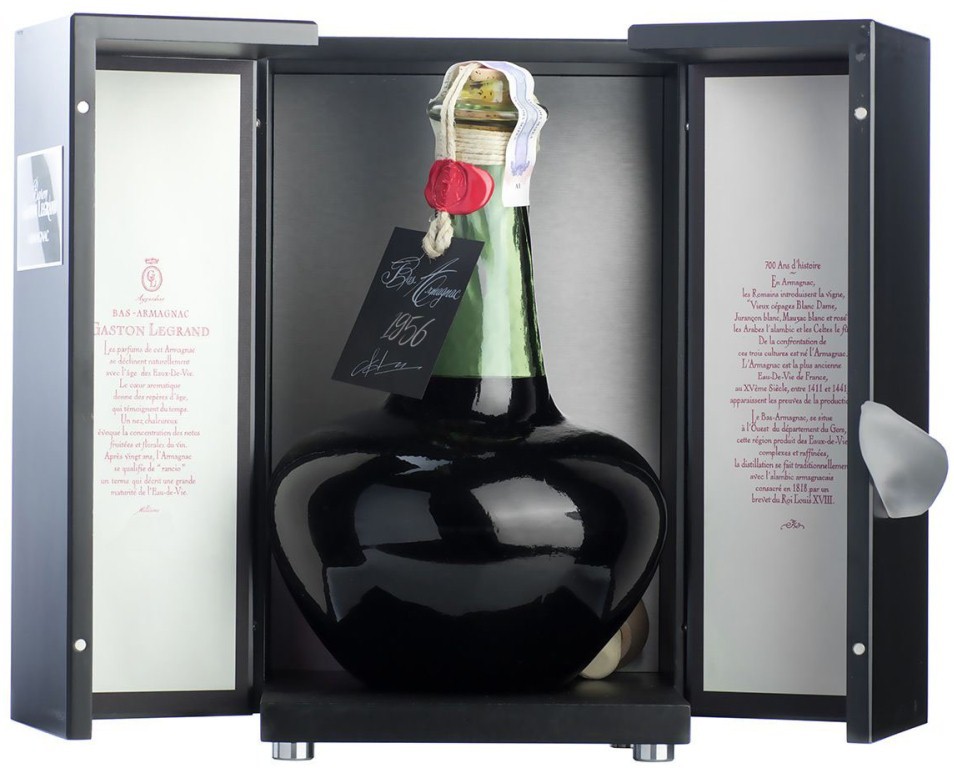 Baron G. Legrand, Bas Armagnac, 1956 — этот арманьяк с превосходно сбалансированными вкусом и ароматом. За долгое время выдержки его спирты потеряли агрессивность и приобрели приятную танинность. Безупречное качество арманьяка согреет тело и душу, подарив изысканное наслаждение. Год производства арманьяка указывается на бутылке. При этом на контрэтикетке можно найти еще и конкретную дату розлива.