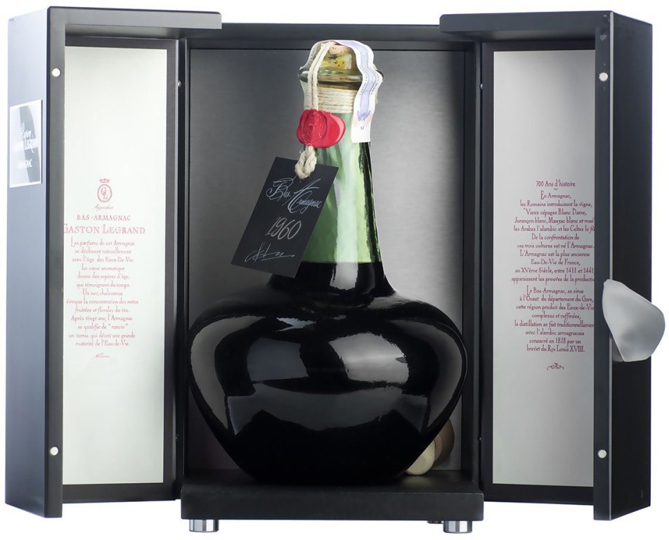 Baron G. Legrand, Bas Armagnac, 1960 — этот арманьяк с превосходно сбалансированным вкусом и ароматом. За долгое время выдержки его спирты потеряли агрессивность и приобрели приятную танинность. Безупречное качество арманьяка согреет тело и душу, подарив изысканное наслаждение. Год производства арманьяка указывается на бутылке. При этом на контрэтикетке можно найти еще и конкретную дату розлива.