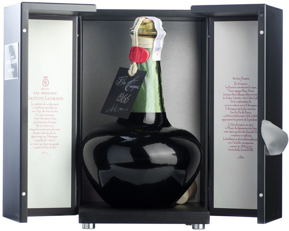 Baron G. Legrand, Bas Armagnac, 1966 — этот арманьяк с превосходно сбалансированными вкусом и ароматом. За долгое время выдержки его спирты потеряли агрессивность и приобрели приятную танинность. Безупречное качество арманьяка согреет тело и душу, подарив изысканное наслаждение. Год производства арманьяка указывается на бутылке. При этом на контрэтикетке можно найти еще и конкретную дату розлива.