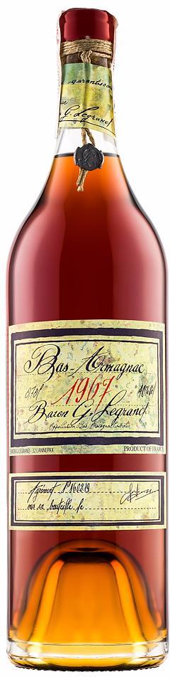 Baron G. Legrand 1967 Bas Armagnac (Барон Г. Легран 1967 Ба Арманьяк) — этот миллезим очень интересен сочетанием вкуса и аромата. Вкус арманьяка отличается многогранностью, а его аромат наполнен великолепным фейерверком разнообразных фруктовых, цветочных и множеством других оттенков. Год производства арманьяка указывается на бутылке. При этом на контрэтикетке можно найти еще и конкретную дату разлива.