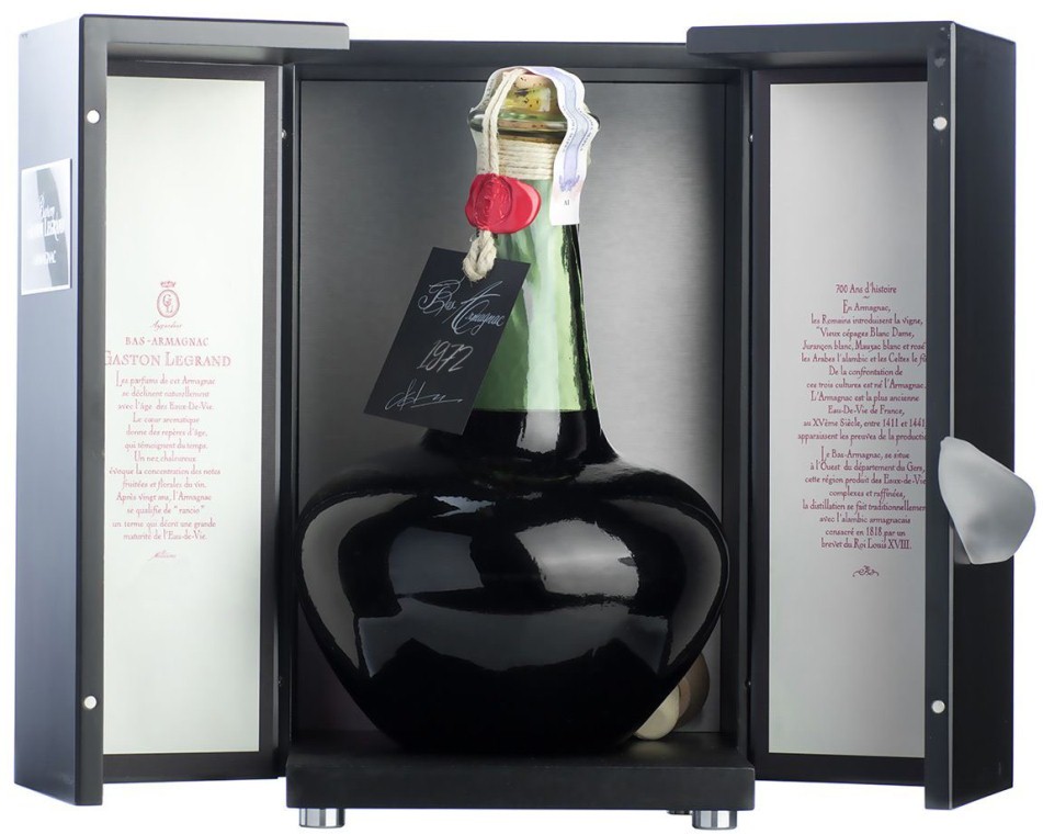 Baron G. Legrand, Bas Armagnac, 1972 — этот арманьяк с превосходно сбалансированными вкусом и ароматом. За долгое время выдержки его спирты потеряли агрессивность и приобрели приятную танинность. Безупречное качество арманьяка согреет тело и душу, подарив изысканное наслаждение. Год производства арманьяка указывается на бутылке. При этом на контрэтикетке можно найти еще и конкретную дату розлива.