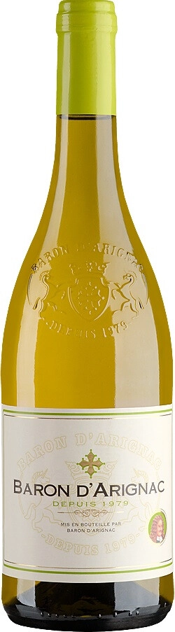 Французское вино Baron d'Arignac, Blanc Demi-Sec обладает нежным ароматом с тонкими нотами белых цветов и легкими оттенками цитрусовых, а также сбалансированным вкусом с приятными фруктовыми тонами. Слегка перезревший виноград подвергают быстрому прессованию при низкой температуре (14-16°C) в течение одной недели. После этого вино осветляют и фильтруют. Дозревает оно в закрытых стальных емкостях. Вино рекомендовано употреблять в качестве аперитива, а также с сырами, салатами, рыбой и десертами.