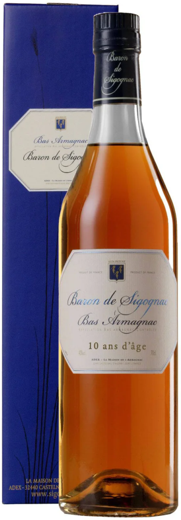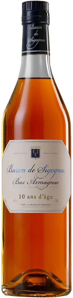 Арманьяк "Барон де Сигоньяк" 10-летний — мягкий, но в то же время обжигающий, он выдерживался в бочках в течение 10 лет. "Baron de Sigognac" 10 ans d'age удостоен золотой медали на международном конкурсе "Интернешнл Челиндж Блай-Бург, 1995", золотой медали на конкурсе "Concours Mondial in Brussel, 2004", серебро на BTI, 2009, звание "Лучший в своем классе" на IXSC, 2009. Арманьяк "Барон де Сигоньяк" — прекрасный подарок к любому празднику.