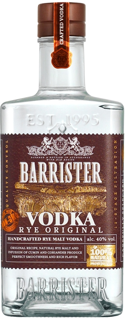 Barrister, Rye Original — мягкая, округлая водка, в производстве которой используется спирт класса "Альфа", питьевая исправленная вода, настои ржаного солода, кориандра и тмина, ароматные спирты можжевеловой ягоды и ржи. Водка хорошо подойдет к соленьям, грибам, рыбе, мясным блюдам и различным закускам.