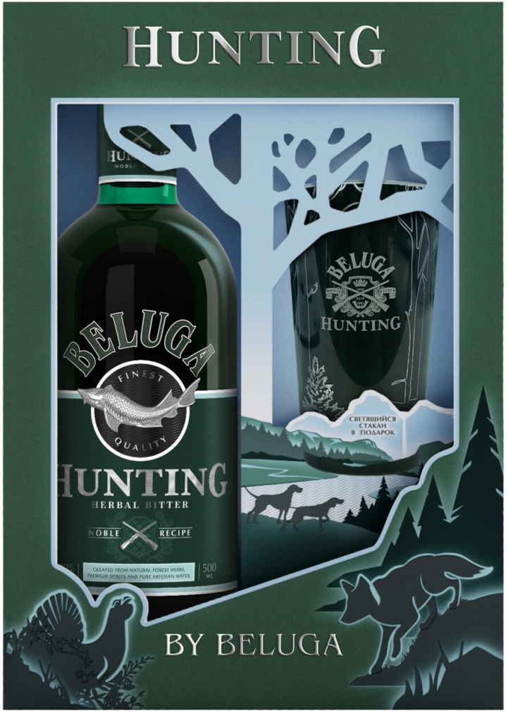 Набор, состоящий из одной бутылки биттера "Beluga Hunting" Herbal объемом 700 мл и светящегося стакана, несомненно, станет отличным подарком близкому человеку.