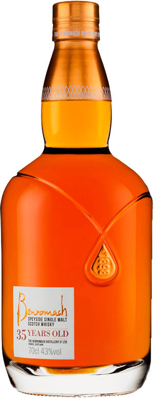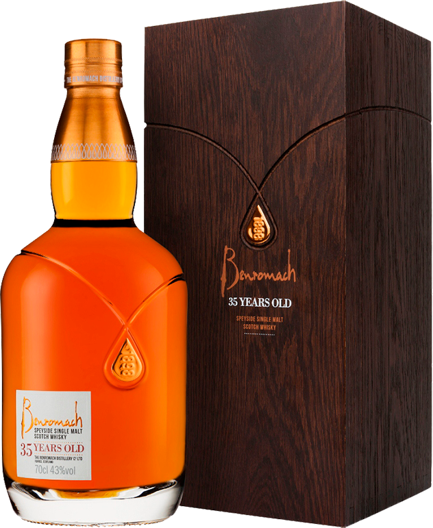 Бутылка 35-летнего Benromach отмечена оригинальным теснением и поставляется в подарочном деревянном боксе.