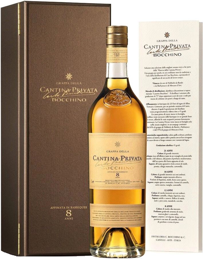 "Cantina Privata" 8 anni— итальянская граппа с насыщенным, богатым вкусом и приятным, сбалансированным ароматом. Для приготовления напитка производитель использует жмых винограда сорта Неббиоло от вин Бароло и Барбареско, а также выжимку сорта Москато д'Асти. Дистилляция граппы производится по методу Лазарито Боккино. Уровень крепости дистиллированных спиртов достигает крепости 75%. Старение граппы на протяжении 8 лет проходит в 225-литровых деревянных бочках из французского дуба Аллье, Тронсэ и Лимузен. Во время выдержки содержание алкоголя в напитке снижается до 45%. За год до розлива спирты из Неббиоло (65%) и Москато д'Асти (35%) купажируются в большой деревянной бочке.