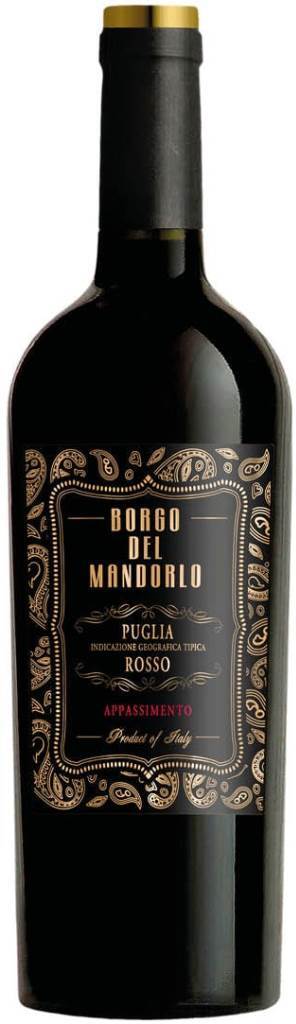 Borgo del Mandorlo, Rosso Appassimento, Puglia — красное полусухое вино с ярким, сбалансированным, округлым вкусом и элегантным, фруктовым ароматом. Вино производится из винограда сортов Санджовезе, Негроамаро, Мерло и Монтепульчано, и т.д. выращенных на виноградниках региона Апулия. Ручной сбор увяленного на солнце винограда (метод аппассименто). Гребнеотделение. Деликатное прессование. Терморегулируемая алкогольная ферментация в емкостях из нержавеющей стали. Продолжительная мацерация. Малолактическая ферментация в дубовых бочках длится 30 дней.
