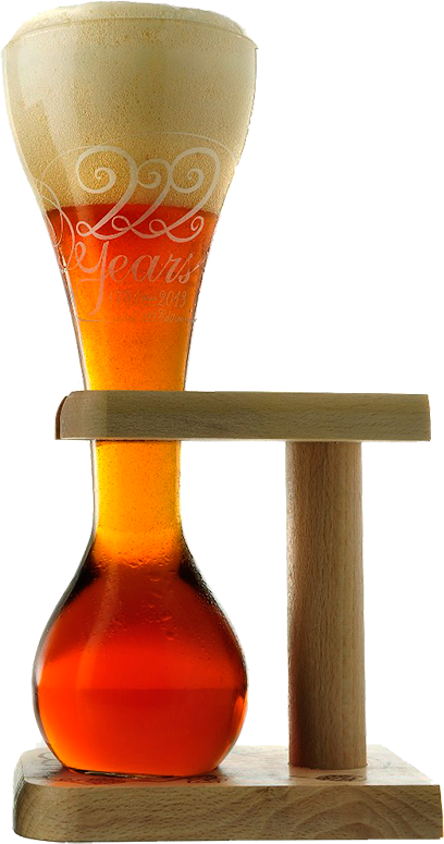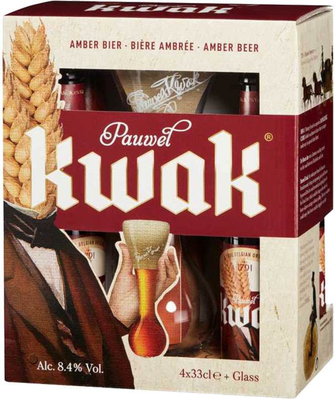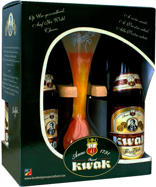 Подарочный набор "Pauwel Kwak" от компании Bosteels 4 бутылки пива "Паувел Квак" объемом 0.33л, а также фирменный бокал характерной формы с нижней шарообразной частью на деревянной подставке.